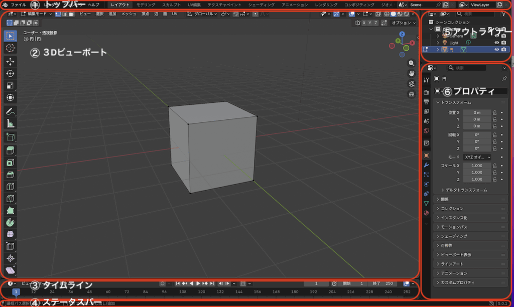 Blenderを開くと、いくつかのエリアに分かれています。