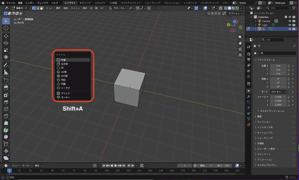 まずは立方体を追加してみましょう。