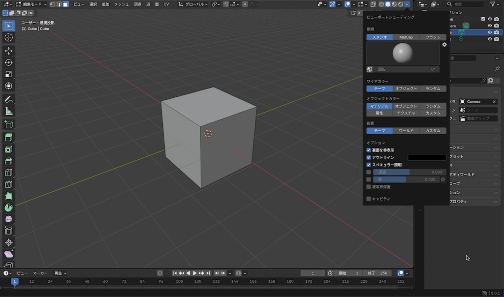 - 3Dビュー右上の Viewport Shading(球アイコン) をクリック