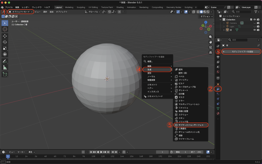 ⑤ Subdivision Surface を選択